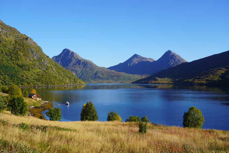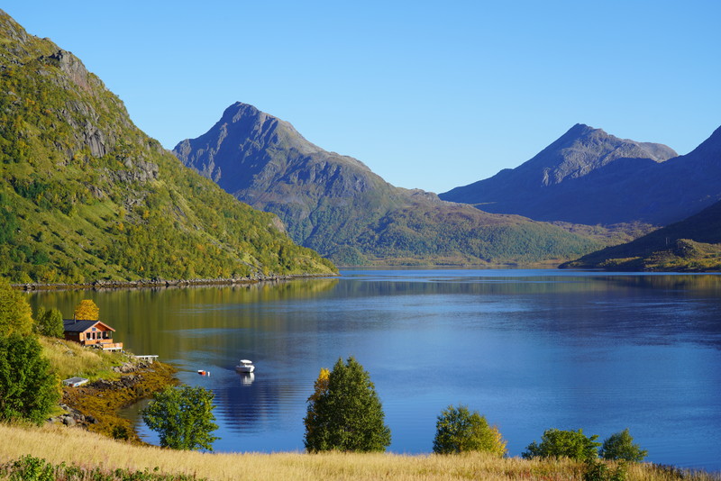 下は今回の旅行で撮影した写真の中で最も好きな一枚です。左下の素晴らしい絶景のフィヨルドに面した別荘と近くに止めてあるボートがまるで映画の一場面のような贅沢な雰囲気を醸し出しています。