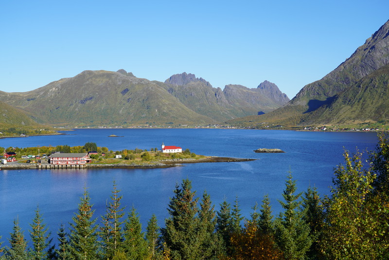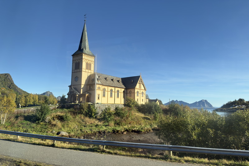 下の写真はスヴォルヴァーから5Kmほど離れたところにあるカヴェルヴォーグの街にある美しいヴォーガン教会です。カヴェルヴォーグはロフォーテン諸島の最も古い街のひとつだそうです。