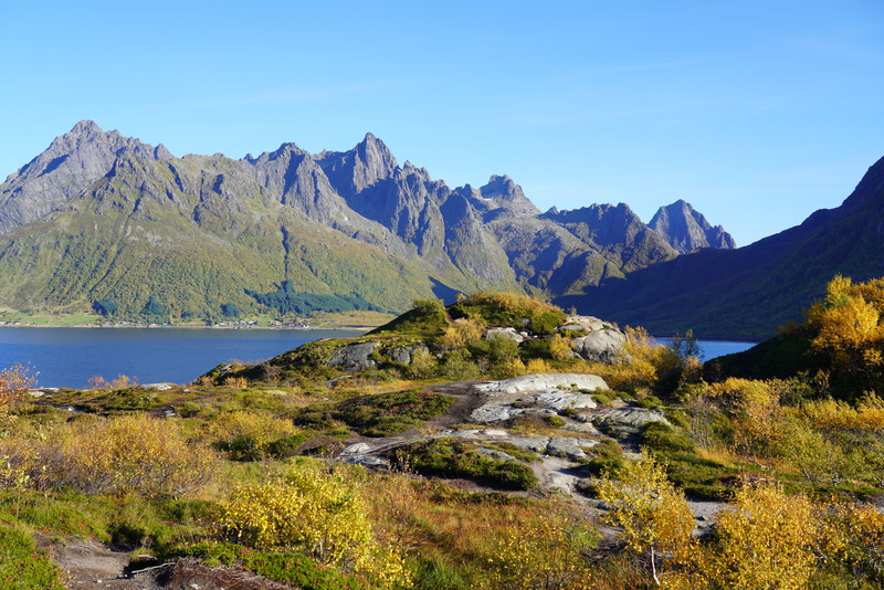 旅程5日目は朝ハシュタのホテルをバスで出発し、フィヨルドの風景を楽しみながらロフォーテン諸島へ行きました。まずヘニングスヴァーという街を観光しました。この日はようやく好天に恵まれて空も海も山も紅葉とともにとても美しく輝いていました。
