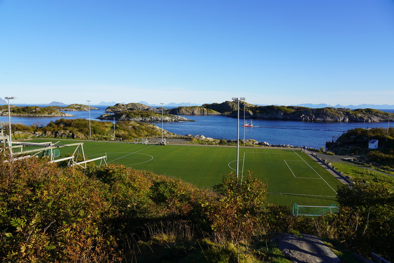 ヘニングスヴァーには絶景の海と山に囲まれた環境にある「世界一美しいサッカー場」があります。下はこの高台付近からそのサッカー場を撮影した写真です。ヘニングスヴァーの南端付近にありました。