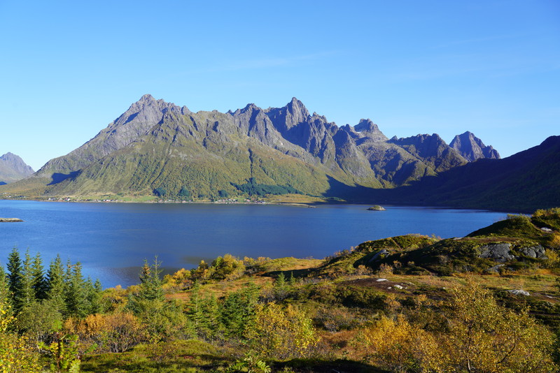 旅程5日目は朝ハシュタのホテルをバスで出発し、フィヨルドの風景を楽しみながらロフォーテン諸島へ行きました。まずヘニングスヴァーという街を観光しました。この日はようやく好天に恵まれて空も海も山も紅葉とともにとても美しく輝いていました。