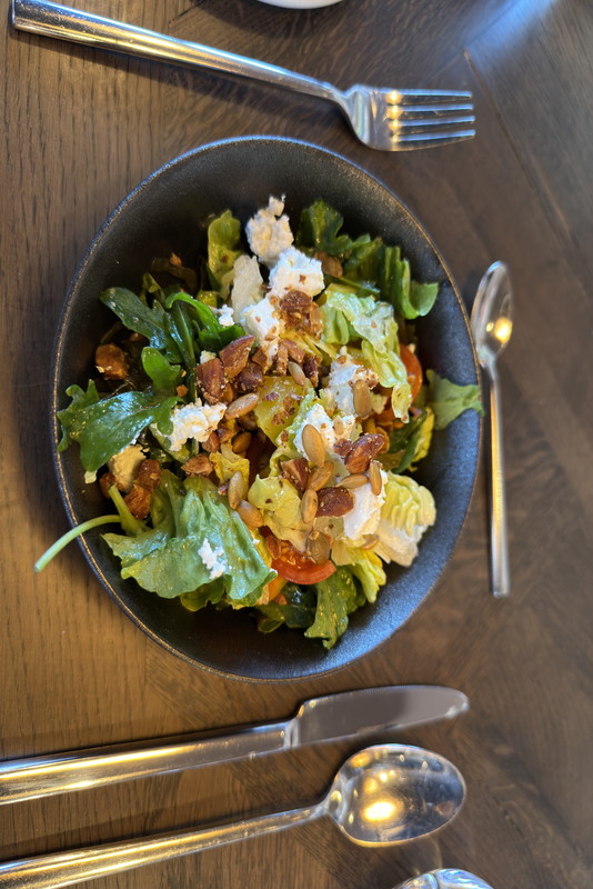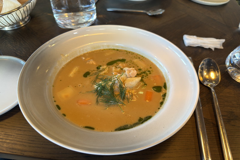 昼食はうれしいたっぷりの野菜サラダ、タラ入りのスープ、ベリーのケーキとアイスクリームのデザートでした。どれもとても美味でした。