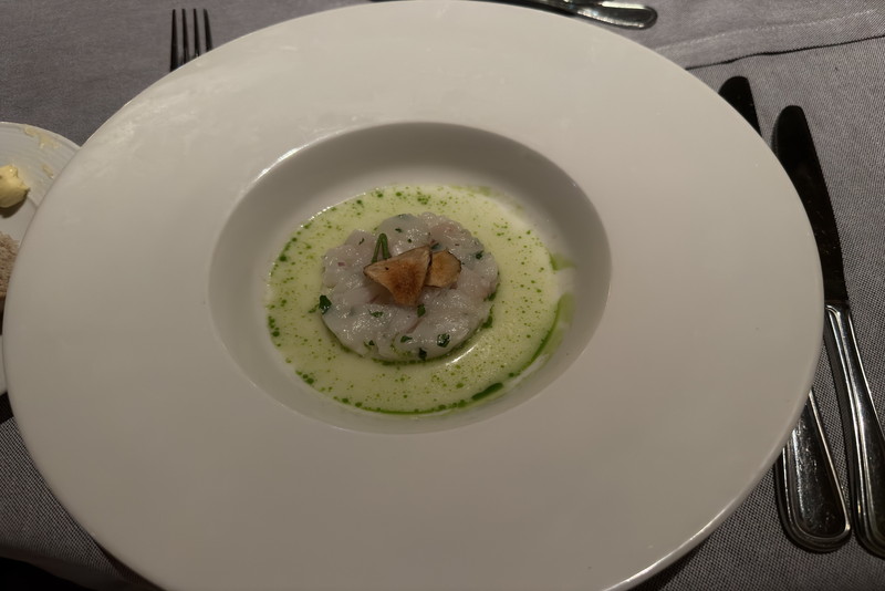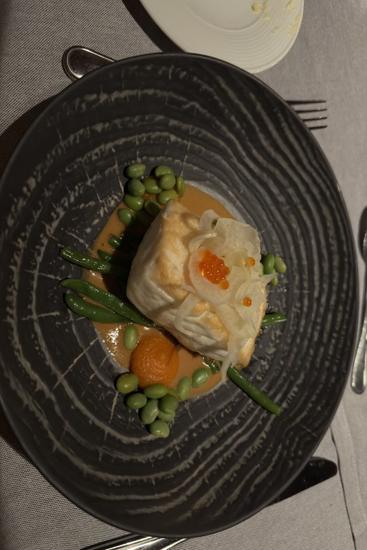 ホテルに到着してまもなく夕食になりました。魚のマリネ風の前菜、白身魚料理、チョコレートケーキとアイスのデザートでした。