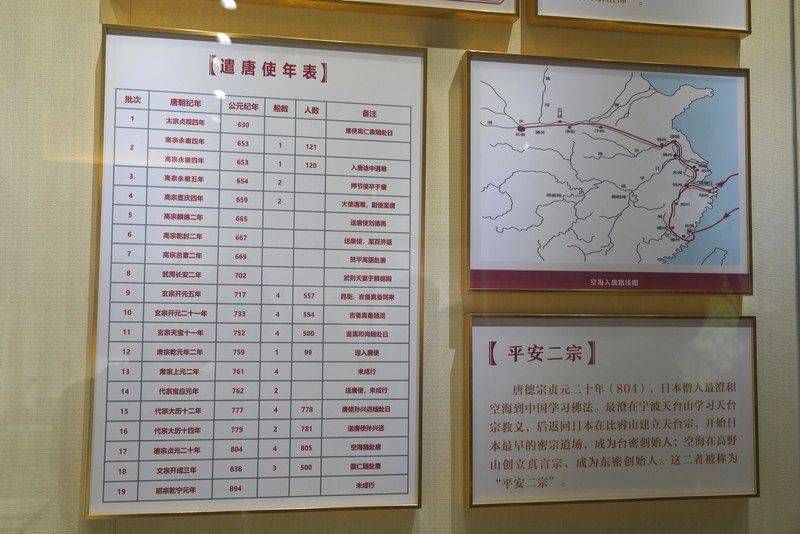館内には日中交流に関わる色々な資料が展示されていて、下は日本が遣わした遣唐使の年表です。