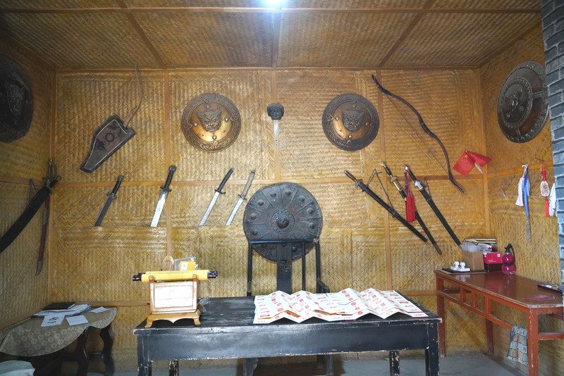左下は西の出口の門です。右下はこの門の中の部屋で、当時の刀や弓などの武器が壁に飾られていました。