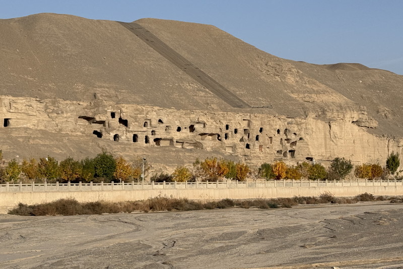 石窟群へ向かうときに渡った橋から見た風景ですが、現在はこの川の水は枯れてしまっているようです(左下)。遠くの方に石窟群が見えました(右下)。