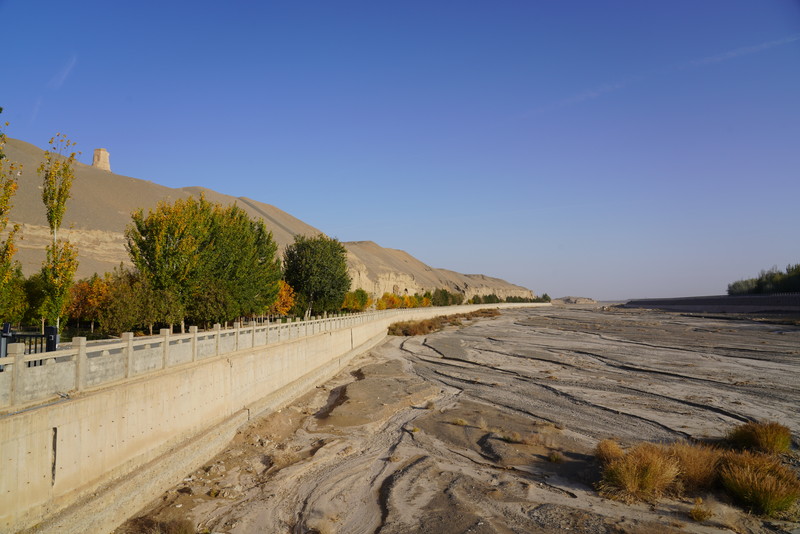 石窟群へ向かうときに渡った橋から見た風景ですが、現在はこの川の水は枯れてしまっているようです(左下)。遠くの方に石窟群が見えました(右下)。