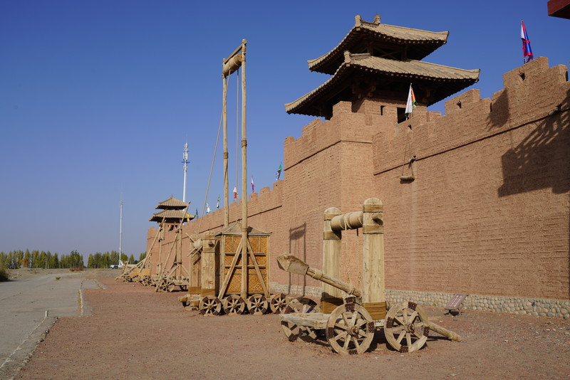 左下は西域の出口の城壁ですが、壁の前に各種の城攻めの器具が並べて展示されていました。