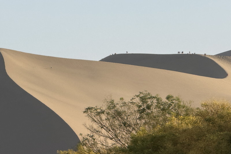 最後に電気カートの基地まで戻ってきた時に周囲の風景を撮影しました。夕日に照らされて赤く染まった美しい砂丘が見えています。また砂丘に登っている人々をズームアップしました。