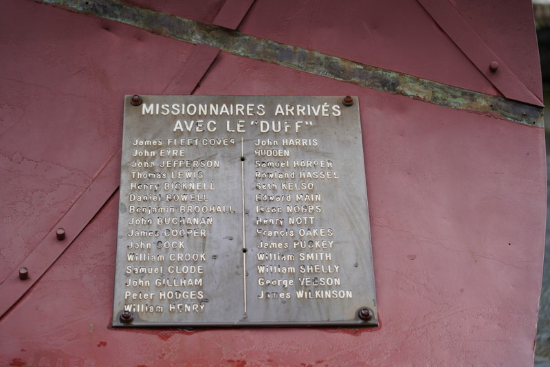 最初に訪れたのは、昔ポリネシア地域に1797年にイギリスから最初に宣教師がやってきてキリスト教の布教活動を始めたマタバイ湾の海岸です。左下は、タヒチ、ハワイなどポリネシア地域の島々がいつキリスト教に改宗したかを表したオブジェです。右下は昔この場所に最初に宣教師が到着したことを記念して設置された記念プレートです。