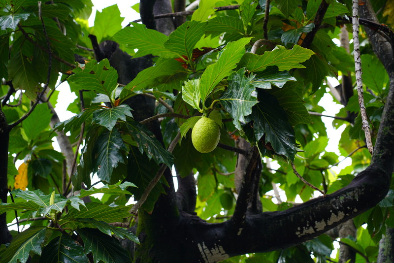 英国の軍艦バウンティ号は、熱帯の果実であるパンノキの実(下の写真)をタヒチで調達する目的でこの場所へ1788年にやって来ました。パンノキの実は安くて栄養価が高いため、西インド諸島の砂糖プランテーションで働く奴隷の食料として重宝されたそうです。タヒチ滞在後英国に帰るころになってバウンティ号で反乱が起き、歴史上有名な暗い事件となりました。