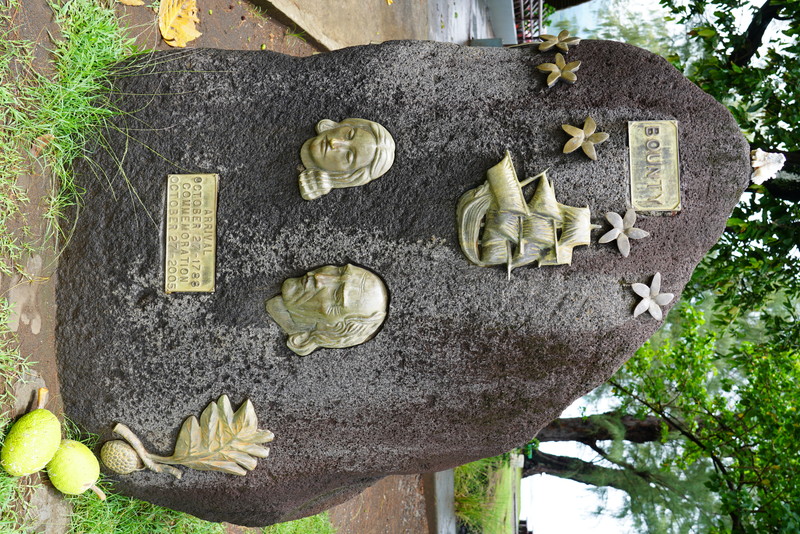 反乱が起こったバウンティ号の記念碑的な石が立っていました。写真の右下に写っているようにパンノキのオブジェとその前に実物のパンノキの実が2個置かれていました。そのうちの1個は私たちのガイドさんが置いたものです。