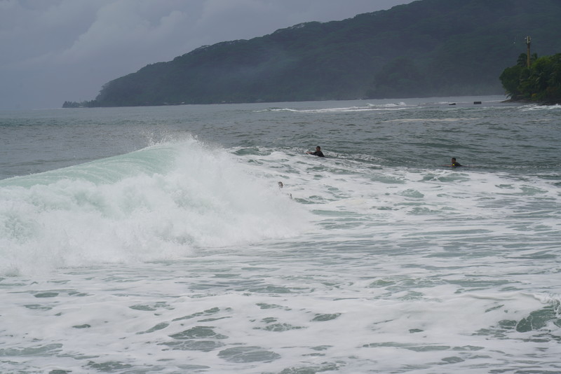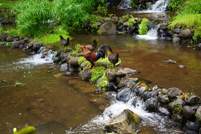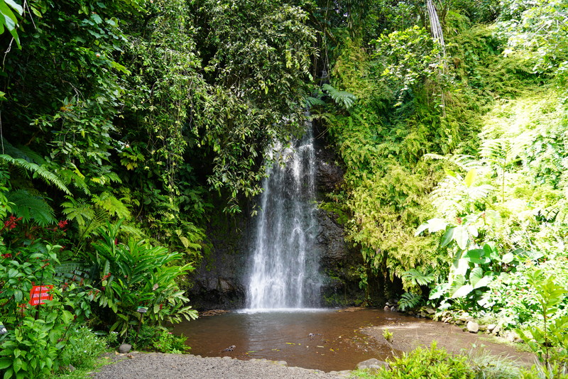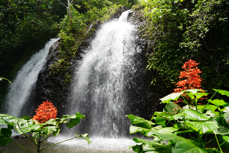 下はファオネの双子の滝です。草と林の中を少し徒歩で進んで行った奥まったところにあり、耳に心地よい滝の音、豊かな緑、赤い花のコントラストが素敵でした。絶好の癒しの場になると思われます。