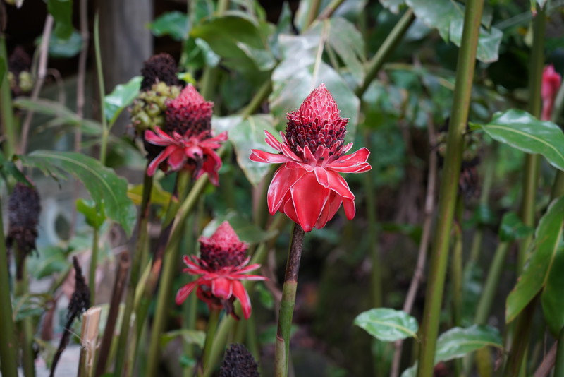 右下はトーチジンジャーでショウガ科の多年草です。まさに赤く炎が燃える松明のようです。