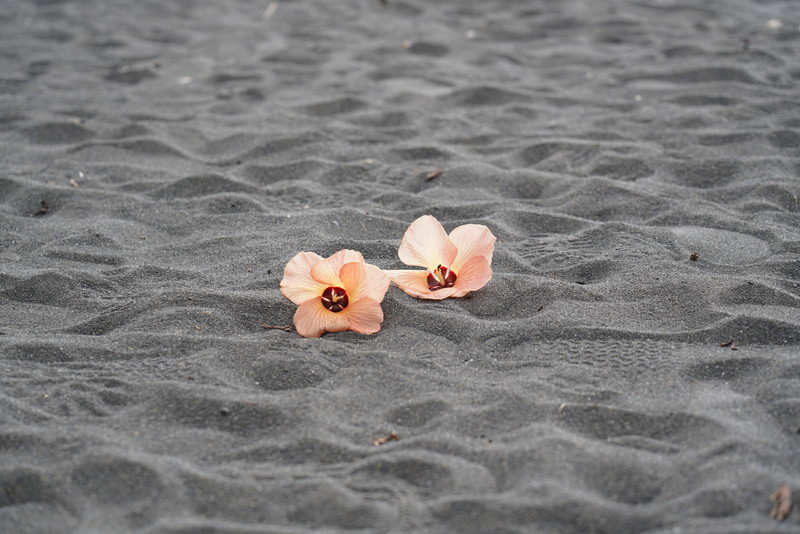 右下の花はシーハイビスカスの花です。ガイドさんが砂浜に置いてくれましたが、今朝最初に訪れたマタバイ湾の海岸に咲いていたシーハイビスカスの花との色の違いを見て欲しかったとのことです。朝は黄色でしたが、夕方にはピンク色に変わっていました。一日で色合いがこれほど変わるのは面白いと思います。