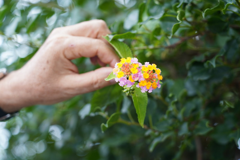 下の写真の花はこの海岸で見つけましたが、一つの花に黄色、オレンジ色、ピンク色と3色もそろっているとても可愛い花です。まさに女性のカンザシになりそうな花です。ガイドさんが摘まんで見せてくれました。