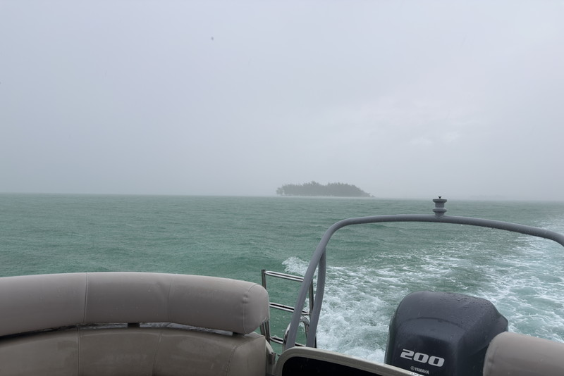 雨が降りしきる中、乗り込んだボートには簡単な屋根しか付いていなかったので、ホテルから借りてきた大型の傘をそれぞれ持ち込みました。