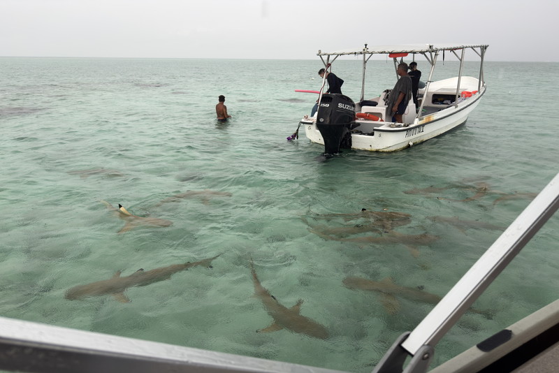 最初はサメがたくさん泳ぎ回っている場所に行きました。ここの水深は腰の高さ程度で、別の船で来ていた観光客がシュノーケリングでサメの観察を楽しんでいました。タヒチのラグーンにいるサメは大人しくて人を襲うことはないそうで、タヒチの現地の人はサメは「お友達」と言っていました。雨が降っていましたが、真夏なので海水の温度は高めだそうです。